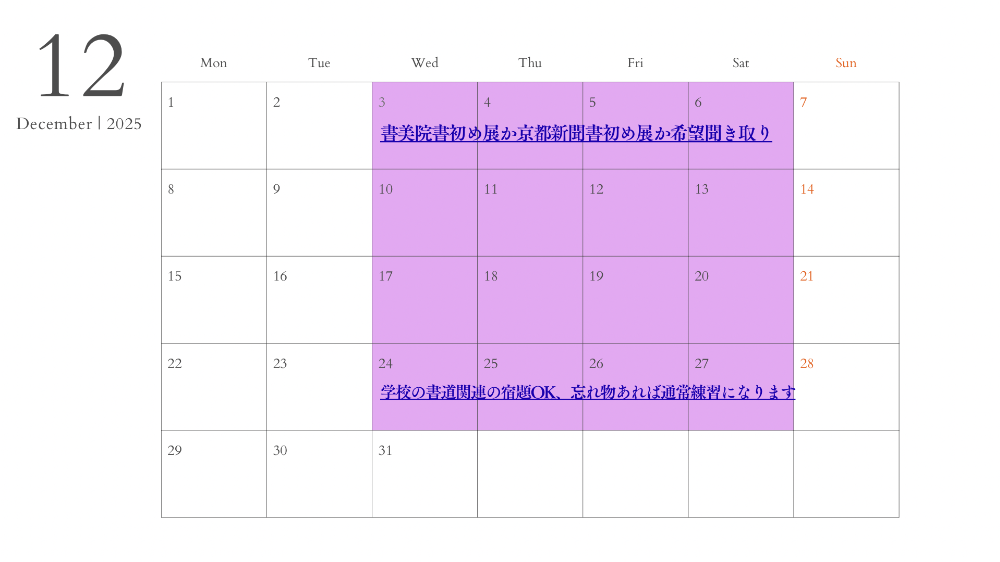 ・12月4回目、希望制で学校の習字関連の宿題ができます。指定用紙や手本お忘れなく。