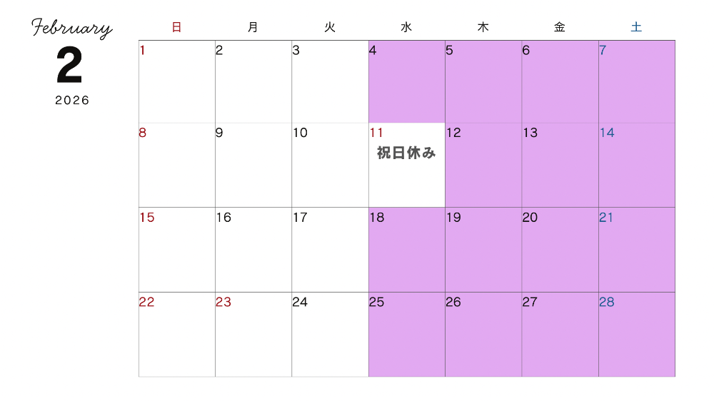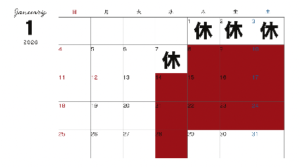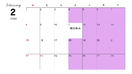 ・祝日は休み。他、各曜日年間回数に合わせて平日でも休みの日を設定しています。